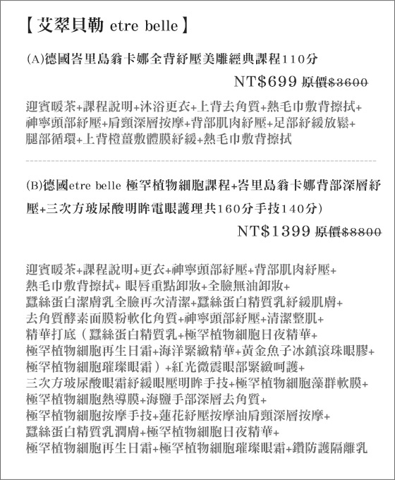 只要699元起即可享有【艾翠貝勒 etre belle】原價最高8,800元SPA課程:(A)德國峇里島翁卡娜全背紓壓美雕經典課程110分(純手技90分,含敷體+去角質)/(B)德國etre belle 極罕植物細胞課程+峇里島翁卡娜背部深層紓壓+三次方玻尿酸明眸電眼護理共160分(手技140分)。